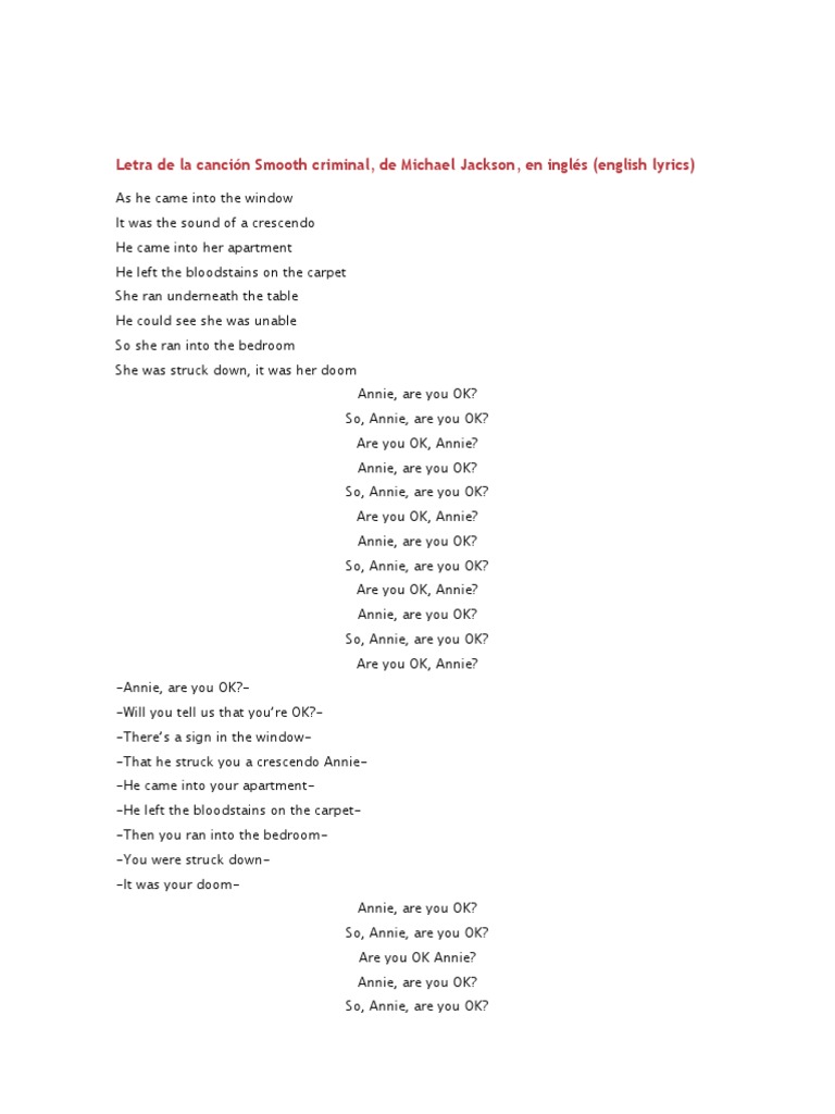 Smooth Criminal Lyrics Michael Jackson Lyricsbuzz Net from lyricsbuzz.net Bloodstains on the carpet refers to dying and birth therefore rebirth. In the movie, band wagon, there is an elaborate bar scene with fred and cyd charisse which smooth criminal borrows heavily from. He came into your apartment left the bloodstains on the carpet and then you ran into the bedroom you were struck down it was your doom, annie. Annie are you ok so, annie are you ok are you ok annie annie are you ok so, annie are you ok are you ok annie annie are you ok so, annie are you ok are you ok annie annie are you ok so, annie are you ok. Today.well i've made a 10 hours (and half lol) of smooth criminalhope you'll enjoy ! As he came into the window was a sound of a crescendo he came into her apartment left the bloodstains on the carpet she was sitting at the Just follow the link below: There's a sound at the window then he struck you, a crescendo, annie.